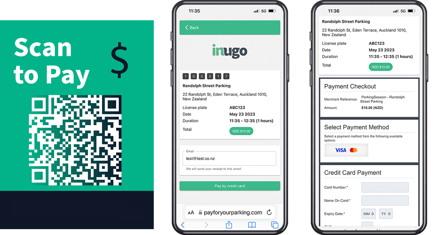 Inugo supports digital payments for parking either through the use of the inugo app or through scan-to-pay. Scan-to-Pay uses QR code technology to allow an app-less and cashless way to pay for parking. The parker scans the QR code and is taken to a webpage to enter their license plate, set their parking session time and pay for their parking. The license plate information is passed to the operator’s enforcement provider to enable a fully integrated and seamless process.